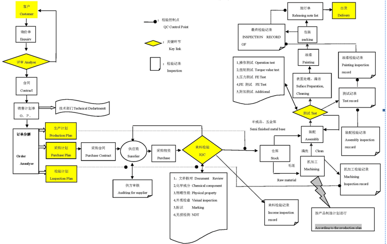 公司按照閥門標準設立有質量網絡檢測節點,實現檢測項目全覆蓋,生產過程層層把關。采取定崗定責、過程檢查、質量考核、責任追究、質量追溯、數據統計分析等一系列行之有效的方法,做到關鍵工序重點控制、普通工序規范操作,通過對生產過程的全面控制和對關鍵節點的有效監督,提高了工作質量,保證了產品質量。